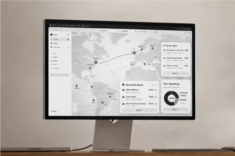 Smidigare resor från start. Boka affärsresor på sekunder i ett intuitivt verktyg som samlar allt på ett ställe – utan utlägg, krångel eller extra administration, och med full överblick över resor.
